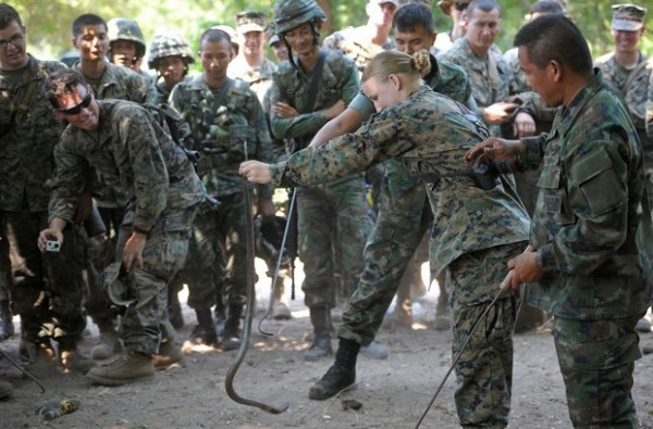 At the same time, however, the photos illustrate the strides the military has taken with respect to identity and diversity. In addition to being instructed by Asian-Pacific allies, the band of brothers now includes sisters on a seemingly equal footing. This photo depicts a female Marine calmly handling a King Cobra as at least one male counterpart grimaces on the sidelines.